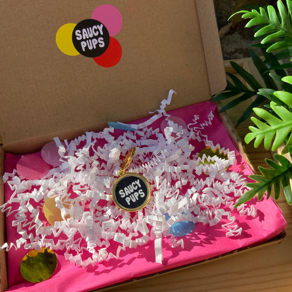 Saucy Pups logo on reverse.