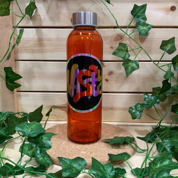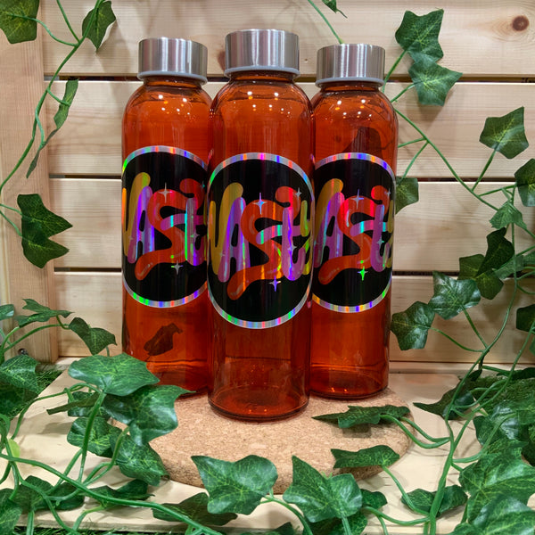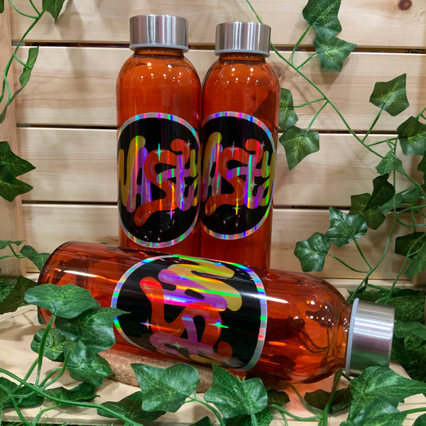 Hollographic vinyl on coloured glass bottle. Please read care instructions below.