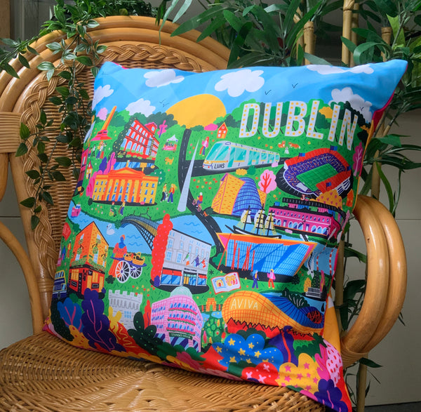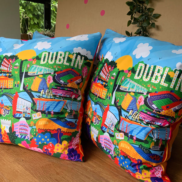 Comfort in Colour ❤️ I am literally in love with these cushions! They are the snuggliest, most colourful cushions in the world. Custom printed, super-soft fabric shows off the glorious colour of the illustration beautifully. Packed with all the iconic Dublin landmarks.