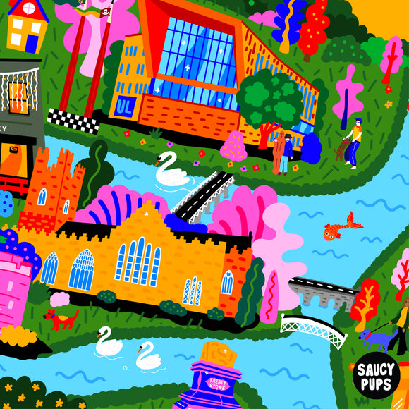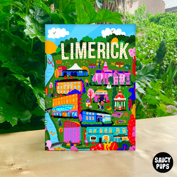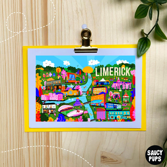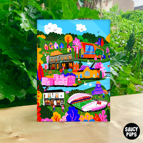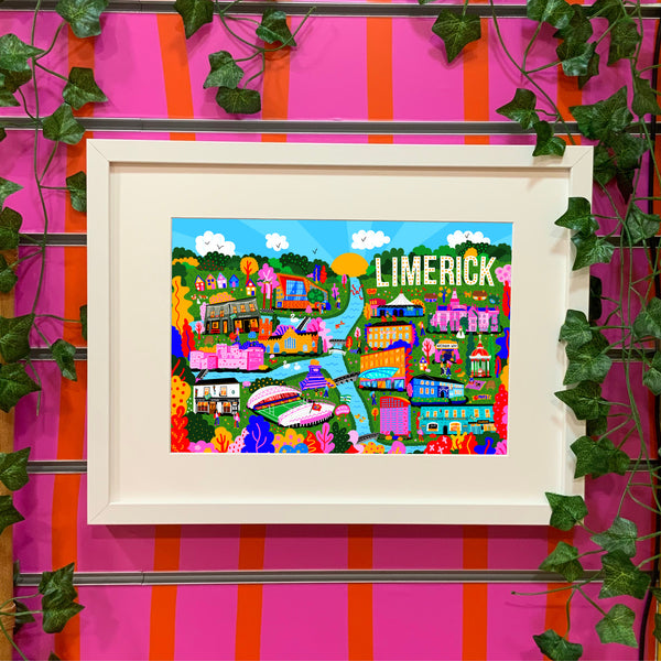 A gloriously colourful illustration of Limerick City, Ireland. Enjoy this bright, happy and joyful illustration of Limerick in your home, or gift to a friend who loves or misses Limerick. The perfect memory of home, no matter where in the world you are.