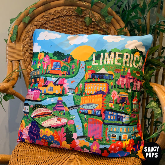This Limerick illustration features Treaty City Brewery, University of limerick (UL), St John's Castle, St Mary's Cathedral, JJ Bowles Pub (Limerick's oldest pub), Thomond Park, Munster Rugby flag, Limerick Institute of Technology sign (LIT), The Treaty Stone, Limerick GAA Flag, The River Shannon, Limerick School of Art and Design sign (LSAD), The Milk Market, Adare Manor (including cottages and golf course), Wickham Way, The Hunt Museum, Brown Thomas, Limerick City Gallery of Art, Dolan's Live Music Venue, Kasbah, Clayton Hotel, People's Park and Bandstand, Mary Immaculate College Sign (Mary I) and all the iconic bridges of Limerick City!