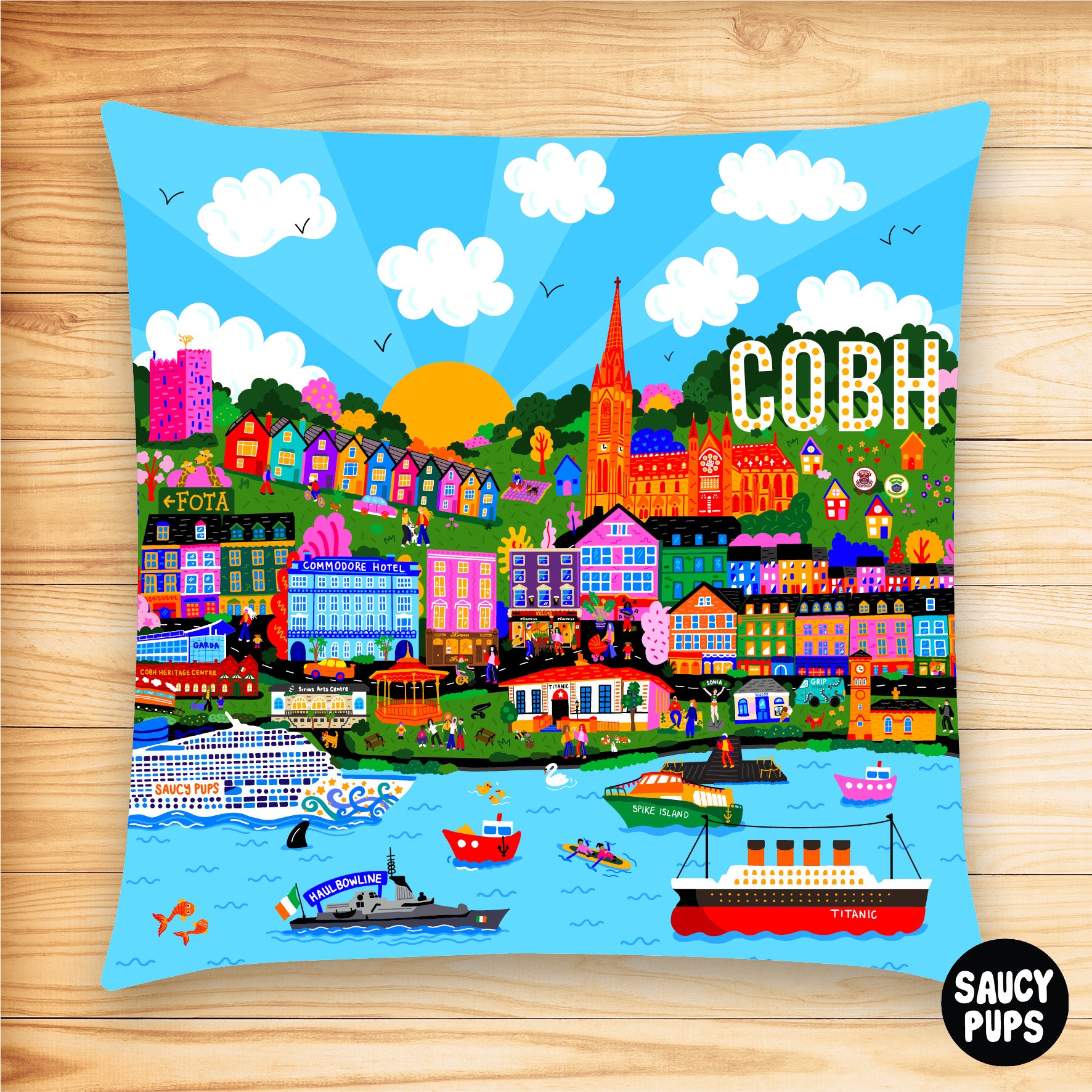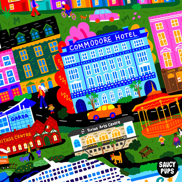 This Cobh illustration features Cobh Cathedral, the famous 'Deck of Cards' houses, Belvelly Castle, Fota, Commodore Hotel, Cobh Garda Station, Cobh Heritage Centre, Train Station, Cruise Liner in the deep water dock, Sirius Arts Centre, The Bandstand, Mimmo's Chipper, Kelly's Bar, Titanic Experience Cobh, Irish Navy ship going to Haulbowline, Spike Island boat, The Famous Titanic, The Promenade, Scoops Ice Cream Shop, Clock Tower, Downstairs Shop, Colourful tall buildings along the waterfront, Cobh Ramblers and Cobh GAA and of course Cork harbour (the second deepest natural harbour in the world... but hey, who's counting!).