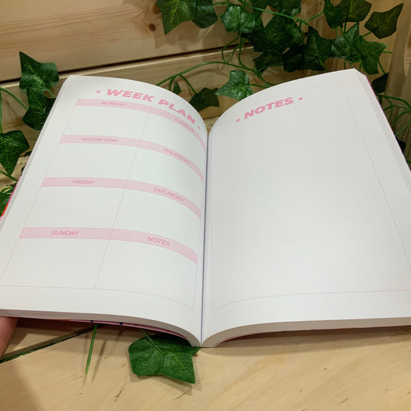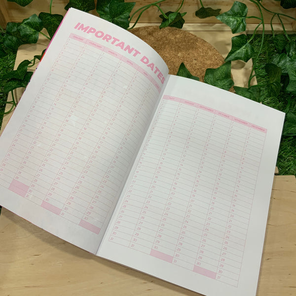 Enjoy a mix of page designs, including: Important Dates, Week Plan, Notes, lined pages (with a space to write your own date), gridded and dotted pages.